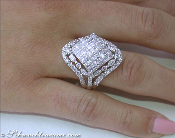 A magnificent luxury jewel that easily meets even highest expectations: This ring, set with diamonds in princess, marquise and brilliant cut, impresses with its masterful manufacturing techniques as well as its highly elaborate design.