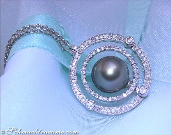 First, in the center of the necklace is a circular white gold rail, which is completely set with diamonds. Set into this circle at the bottom is a stately, completely flawless Tahitian pearl, silky smooth skin, shining anthracite-silver with the best high gloss luster.