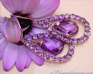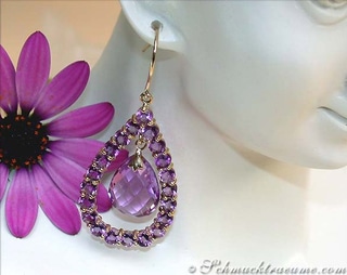 Two pear shaped blue topazes are attached in the middle, freely movable, and also cut in immaculate briolet cut (chessboard).