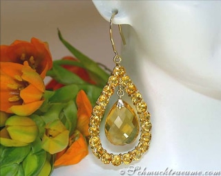 Both yellow gold hooks (so-called goose neck) are first of all connected to two large pear-shaped yellow gold rails, which are completely lined with shimmering, completely transparent blue topazes.