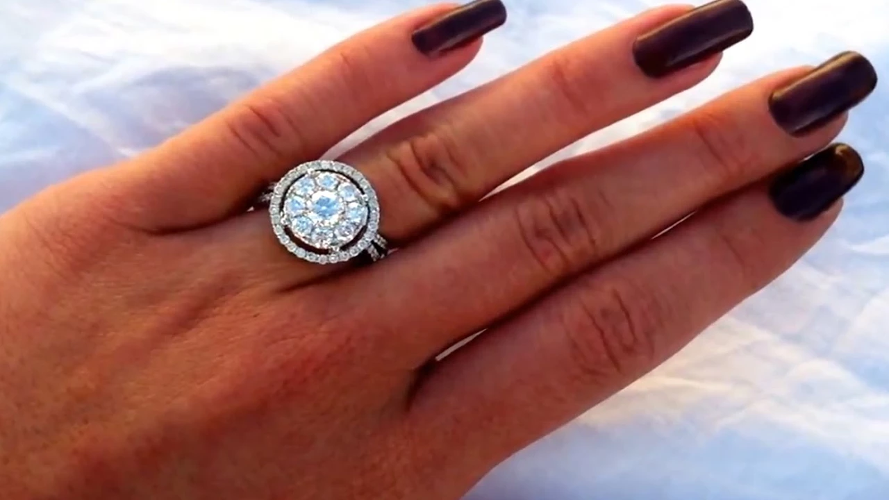 First, the ring head is dominated by a half carat brilliant cut diamond (0.51 ct. G SI) that is set into the middle. It is surrounded by eight big brilliant cut diamonds. All diamonds are set very close and seamlessly to each other – one sees only diamonds and almost no whitegold. When being seen from a distance, one might almost think you wouldn’t wear a ring with several diamonds but rather a single, huge diamond solitaire.