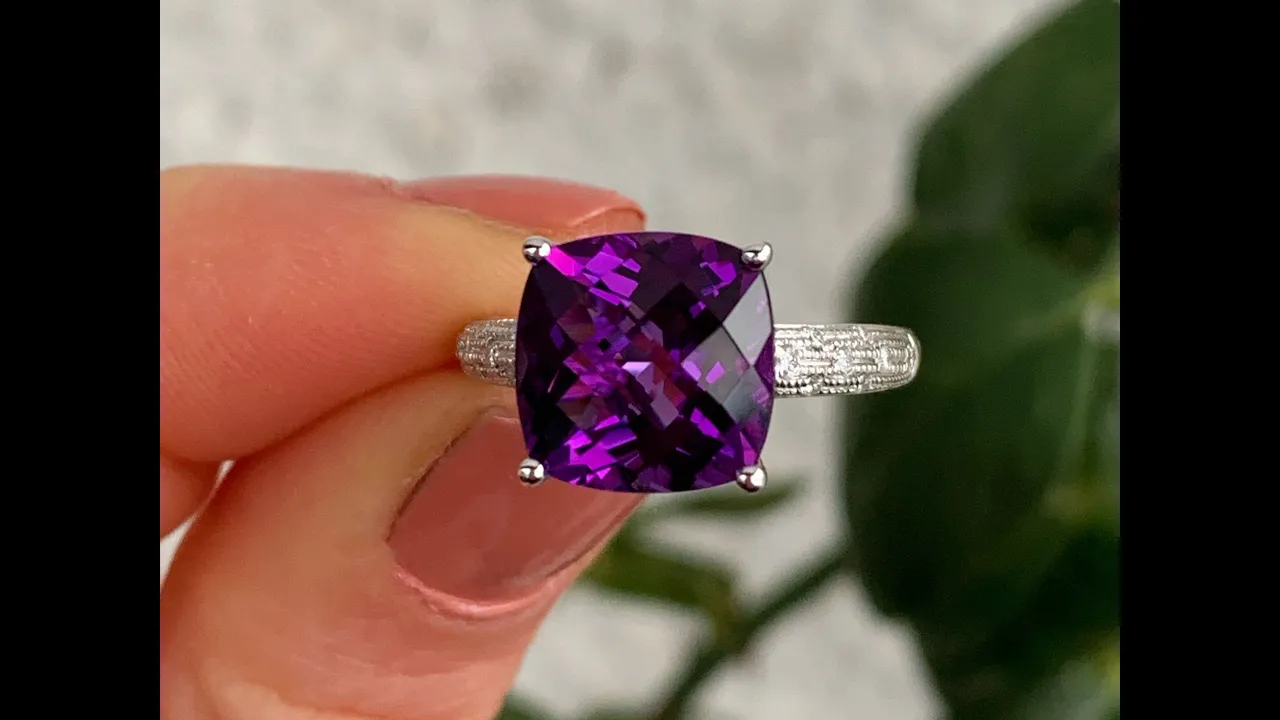 In die Mitte des Ringkopfs ist ein intensiv leuchtender Amethyst im Carré Schachbrett-Schliff gesetzt. Dieser ist oben durch vier Weißgold-Krappen und unten in ein Weißgold-„Körbchen“ eingefasst.