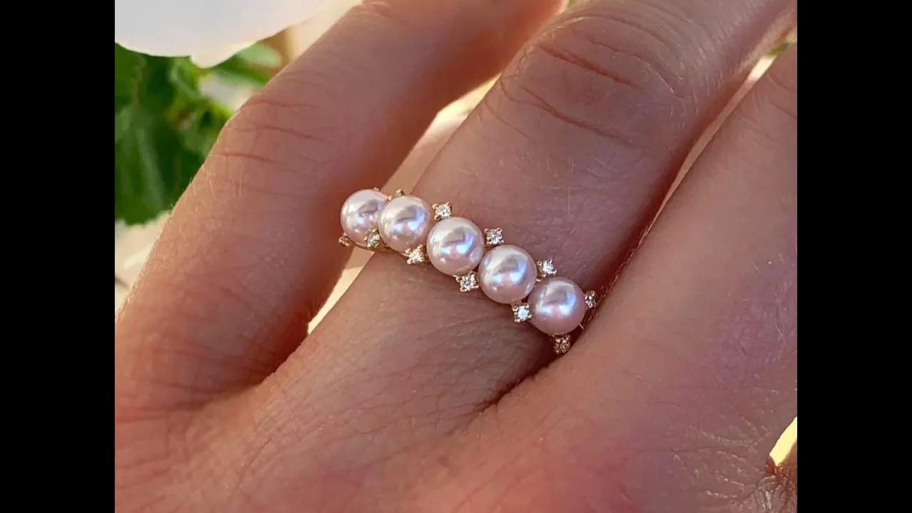Zunächst wird die Vorderseite des Rings von insgesamt fünf Baby Akoya Perlen dominiert, die durch eine perfekte Rundung sowie einen glänzenden Lüster verzaubern. Die Perlen schimmern leicht rosé, was den Charme dieses Rings zusätzlich unterstreicht.