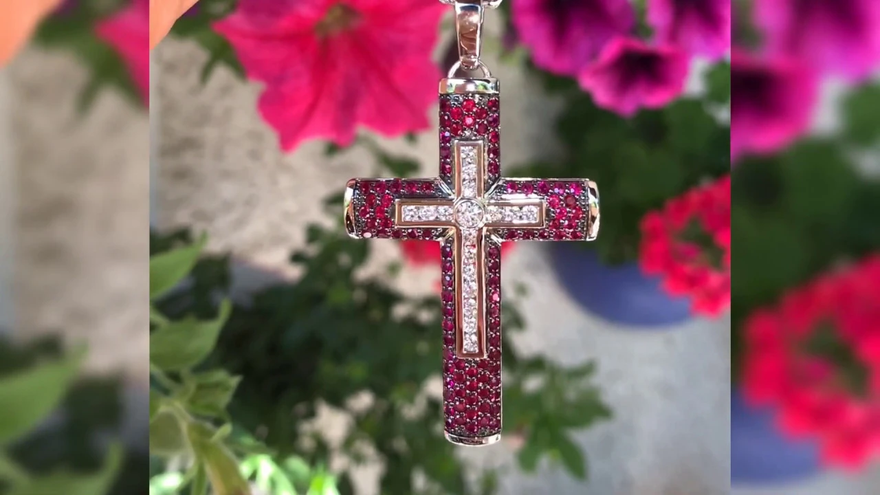 The stately cross is fully paved with deep pinkish red shimmering rubies and white brilliant cut diamonds.