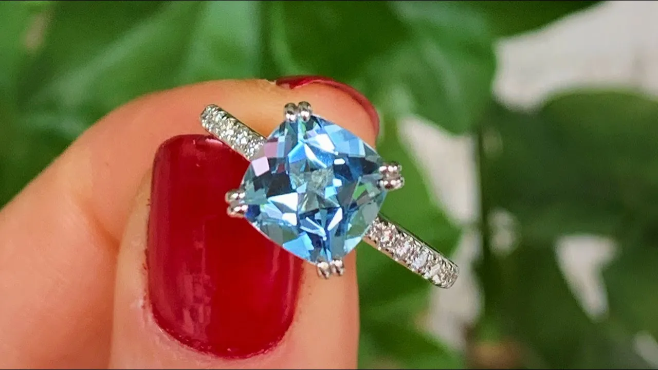 First of all, this ring is dominated by a gorgeous aquamarine: flawless square cushion cut, gorgeous sky blue color, no inclusions whatsoever. This gemstone is held by four stable claws, which merge into double claws at the top and thus protect the corners of the aquamarine particularly well.