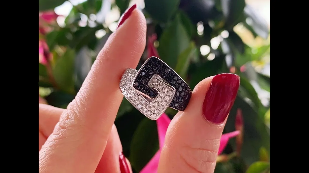 Casual elegance and unconventional chic characterize this interesting belt style ring with black and white diamonds. A piece of jewellery for ladies who prefer pieces that can be worn every day, but do not want to do without a touch of extravagance.
