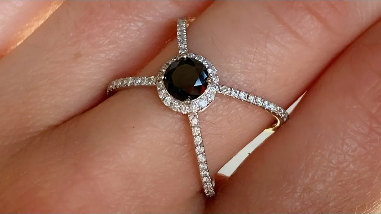 Initially, this ring is dominated by a round faceted black diamond, which is the centerpiece of the ring. It is surrounded by smaller white diamonds (Halo Design).