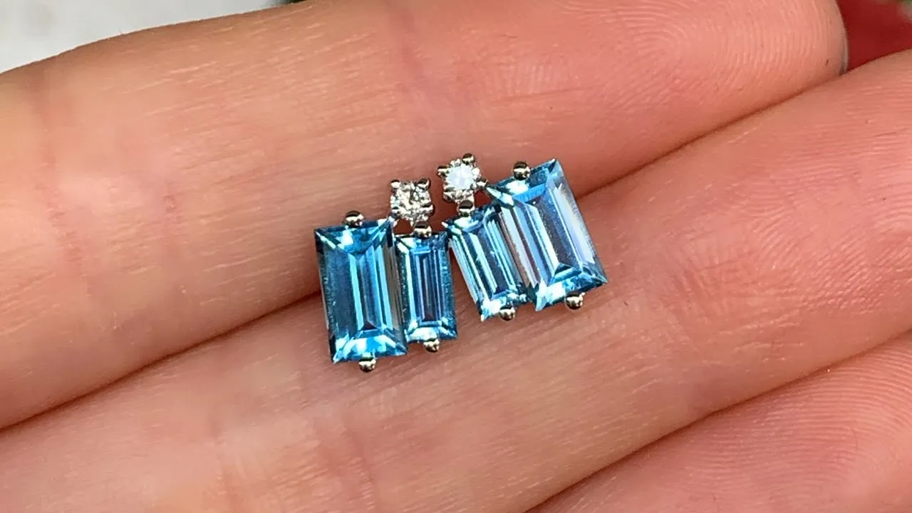 Delicate Baguette Cut Blue Topaz Stud Earrings with Diamonds