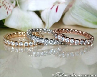 These rings can be combined perfectly and according to your taste and mood: You can wear all the three together so that it looks like a single three row diamond ring, but you can also wear a single one, two ones or combine one with another ring (for example an engagement or wedding band).