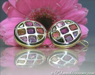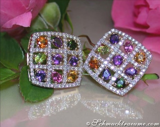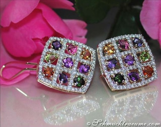 The earrings are set with two pear shaped blue topazes, two pear shaped pink sapphires and two marquise cut citrines. All stones impress with their outstandingly intense colour brilliance.