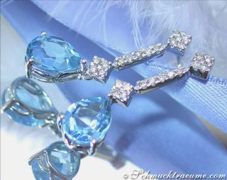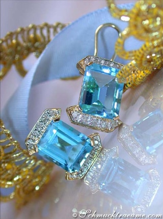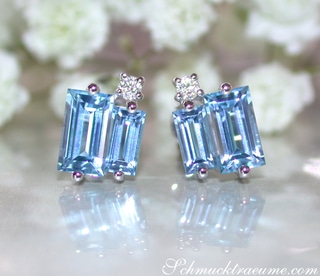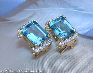 In die Mitte beider Ohrstecker wurde je ein großer Blautopaz (völlig augenrein, herrlich swiss-blue leuchtend) im Smaragd Schliff gesetzt.
