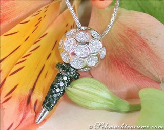 Der Schlägerkopf unten ist nun ebenso mit Brillanten ausgefasst. Darauf ist ein Golfball gesetzt, der rundum mit Brillanten ausgefasst ist.