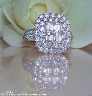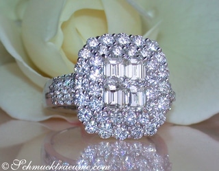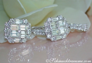 Weiterhin sind rechts und links in die äußere Einfassung zwei weitere feinste Diamanten gesetzt, diese nun in makellosem Baguette-Schliff (0,30 ct. TW+ VVS).