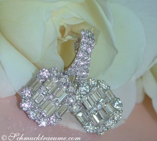 In die Mitte des Anhängers sind zunächst vier große Diamanten eng aneinander gesetzt: makelloser Smaragd Schliff (Emerald-Cut), 1,23 ct. TW+ IF (Feines Weiß / Lupenrein)