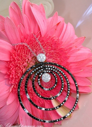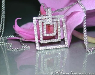 Der gesamte Anhänger ist in Kreisen gestaltet, welche von oben nach unten kleiner werdend eng aneinander angeordnet sind und komplett mit feinsten Brillanten (2.98 ct. TW-VS) ausgefasst sind.