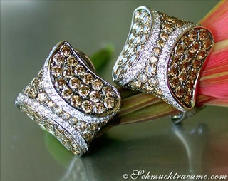 Der rautenförmig gestaltete, wunderschön geschwungene Ringkopf ist bis weit in die seitlichen Ringschienen hinein mit sehr guten cognac-braun schimmernden Brillanten ausgefasst.