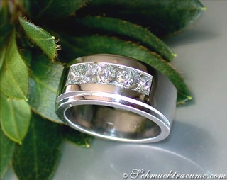 Über die gesamte Länge des Ringkopfs sind, etwas erhöht, fünf Diamanten in makellosem Princess-Schliff in Kanalfassung gesetzt. Jeder einzelne Diamant wiegt hier bereits 0,306 Karat.