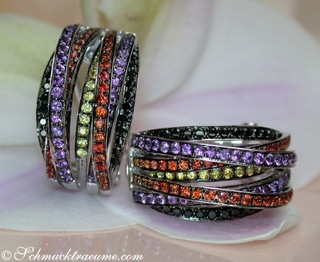 Mehrreihiger Ring mit schwarzen Diamanten, Amethysten & Saphiren
