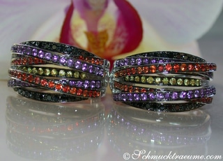 Über die gesamte Länge des Ringkopfs bis in die seitlichen Ringschienen hinein verlaufen solide gearbeitete Weißgold-Schienen, die mit schwarzen Diamanten, Amethysten sowie intensiv leuchtenden orangen und gelben Saphiren ausgefasst sind. Dabei überzeugen alle Farbsteine durch** herrliche Transparenz und makellose Farbintensität**.