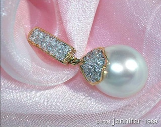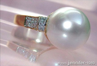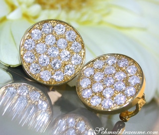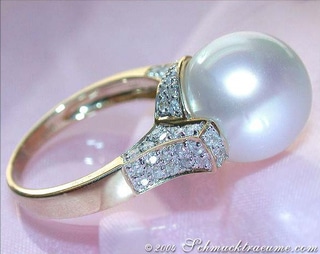 An auf den Vorderseiten komplett mit Brillanten ausgefassten, leicht abgerundeten Gelbgoldfassungen schließen sich zwei große Südseeperlen an - perfekt gerundet, seidig glatte Haut, bester bis sehr guter Lüster, völlig makellos, silber-weiß schimmernd.