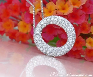 Ein höchst attraktives wie auch außergewöhnliches Schmuckstück präsentieren wir Ihnen mit diesem kreisförmigen Anhänger, ausgefasst mit feinsten Smaragden und Brillanten.