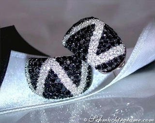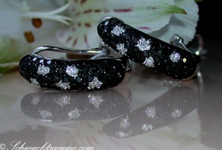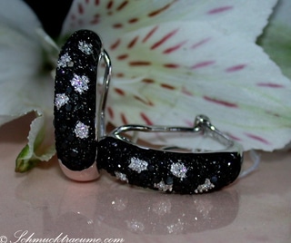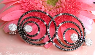 In diese Brillanten-Stege sind nun zwei Weißgold-Ovale eingeführt, die - von oben nach unten breiter werdend - komplett mit tiefschwarz schimmernden Diamanten ausgefasst sind.